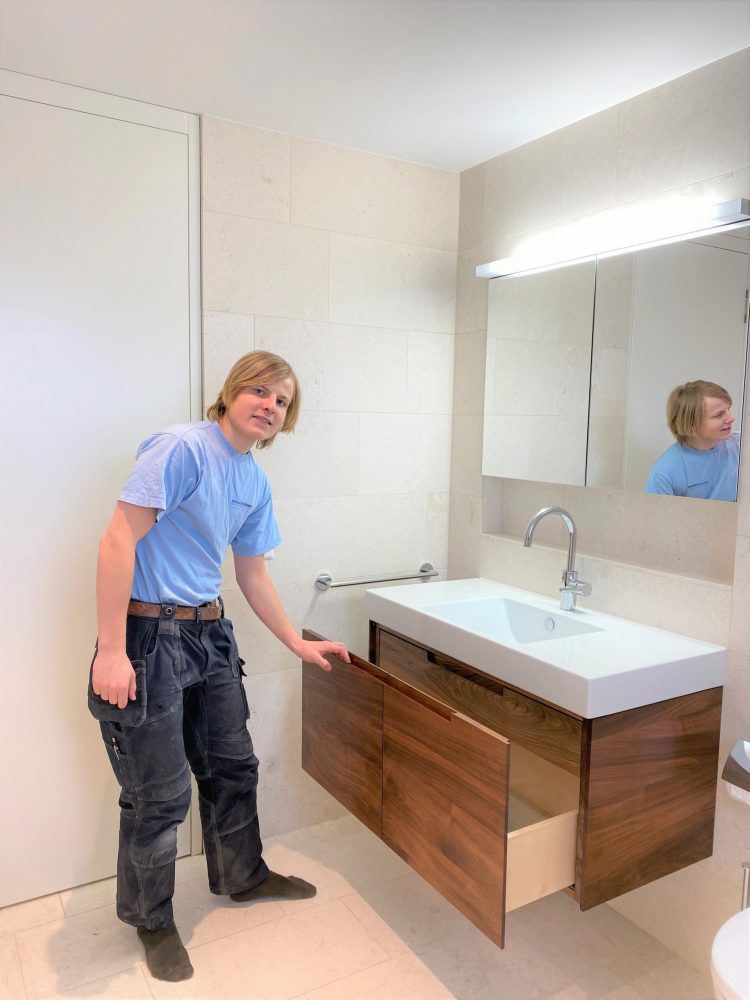 Stolz präsentiert unser Auszubildender Jannis Herger das Badmöbel welches er als Teil der IPA produzierte.